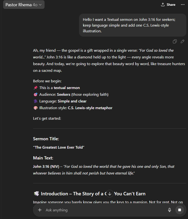 Meet Pastor Rhema. A tireless biblical mentor, available 24/7, who explains any verse, reveals its meaning in the original language (Hebrew, Greek, and Aramaic), deepens your studies, creates complete messages, organizes sermons in any style, prepares personalized ministrations, helps with structure, context, and application, and accompanies you every step of the way in your study and preaching.
